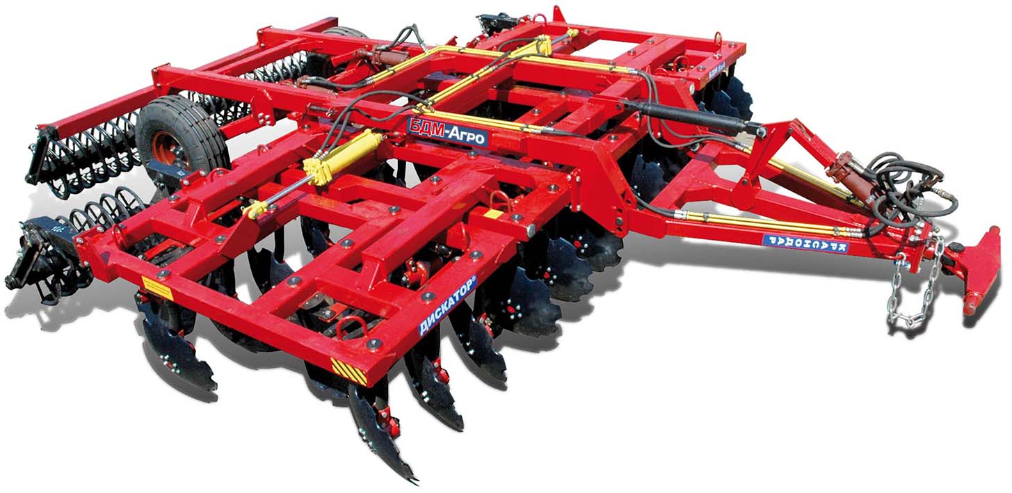 Дискатор БДМ БДМ-5х4ПК – дисковое почвообрабатывающее орудие. Предназначен для поверхностной обработки почвы на глубину до 15 см., уничтожения сорняков, измельчения пожнивных остатков, омоложения лугов и пастбищ.4-х рядная цельнорамная дисковая борона Дискатор БДМ-5х4П% совмещает 3 операции за один проход: уничтожение сорной растительности; рыхление слоя почвы до посевного состояния с уплотнением катками; выравнивание рельефа поля. Отсутствие единой оси исключает наматывание пожнивных остатков и забивание междискового пространства.