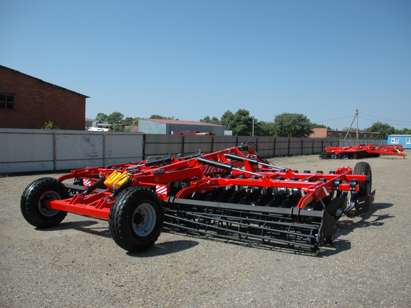 Большая рабочая скорость обработки (до 18 км/ч) позволяет достигать превосходного эффекта измельчения, перемешивания и улучшения крошения почвенного комка, благодаря полному перекрытию рабочей ширины рабочими органами и сдвоенным опорным шлейф-каткам разного диаметра. Вибрация пружинной стойки во время работы дополнительно улучшает крошение почвы. Глубина обработки до 12 см регулируется винтовым механизмом передних опорных колес и задними опорными катками. Сферические диски Bellota диаметром 560 мм установлены наклонно, на индивидуальных пружинных стойках Bellota в 2 ряда, что способствует лучшему обороту отрезаемого пласта, а также снижению требуемого тягового усилия трактора.